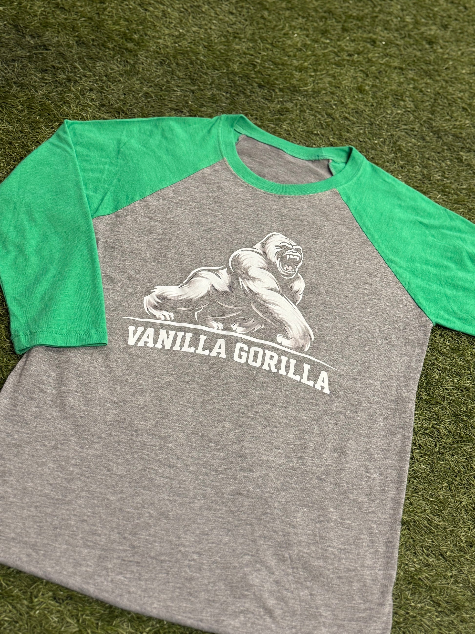 Comfortable, breathable, and soft Grey 3/4 kelly green sleeve T-shirt with our Walking Gorilla design on front. Triblend Unisex Crew Neck.