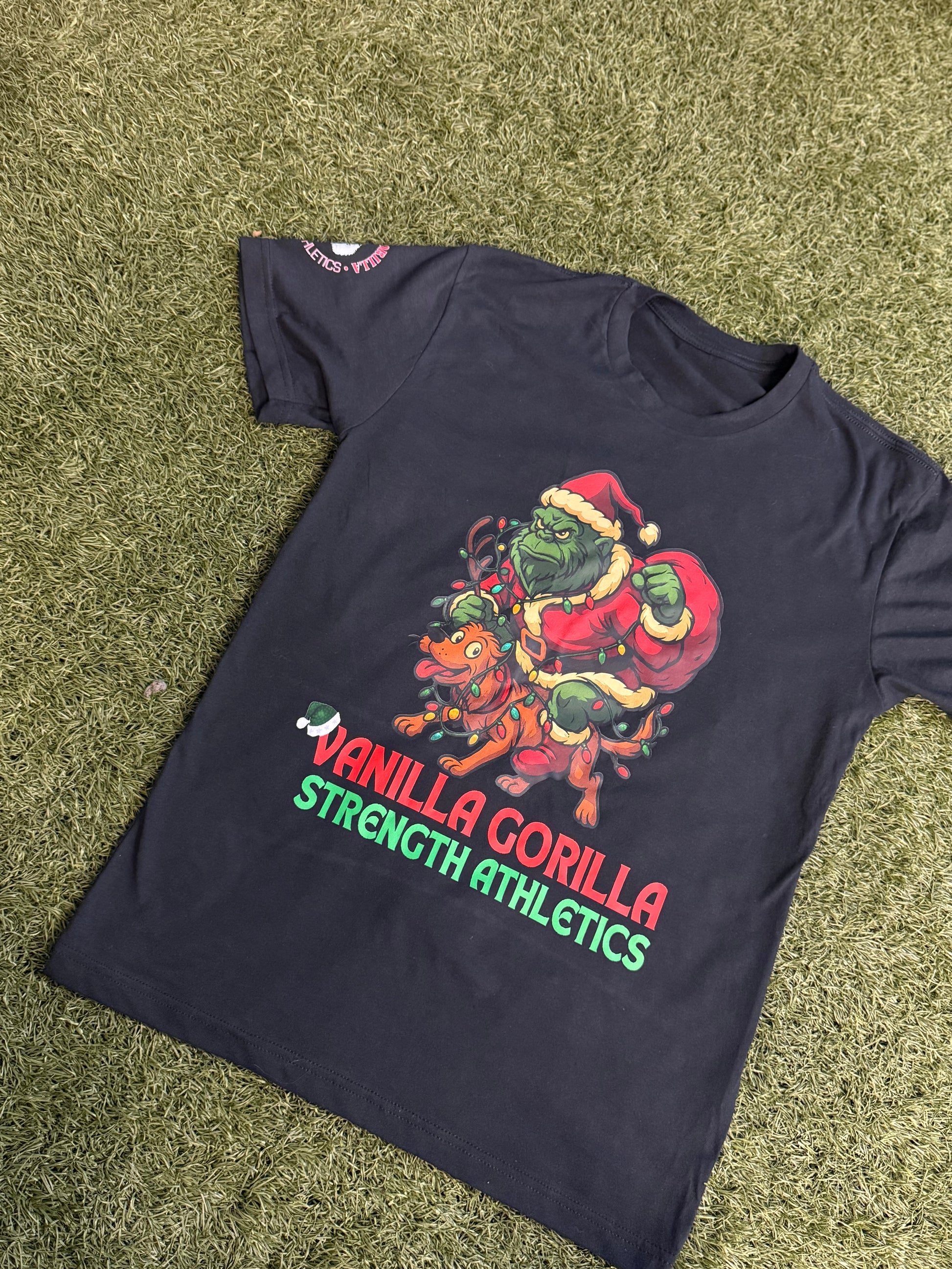 Comfortable, breathable, and soft Black T-shirt with the Christmas Gorilla Grinch design on the front .