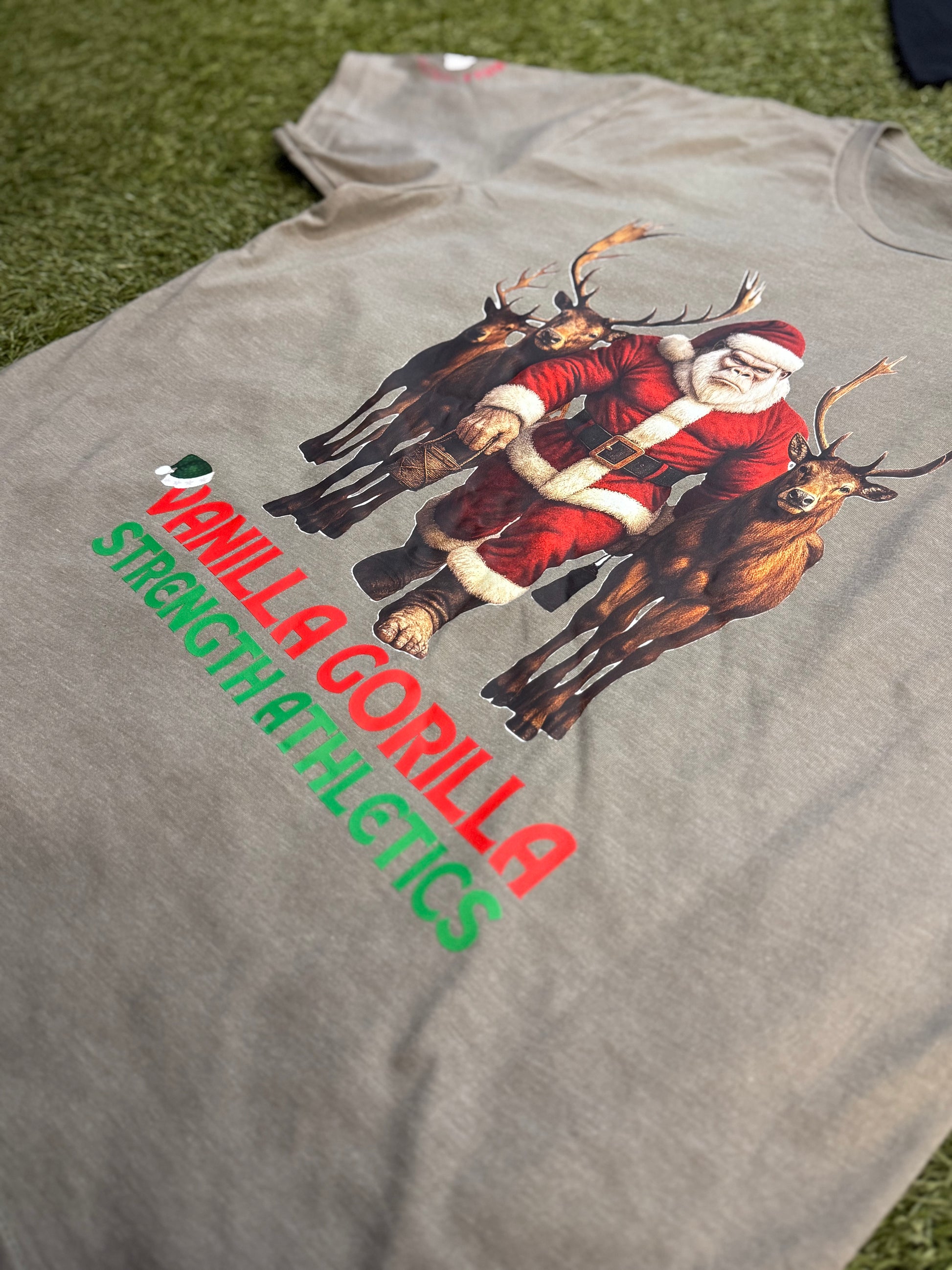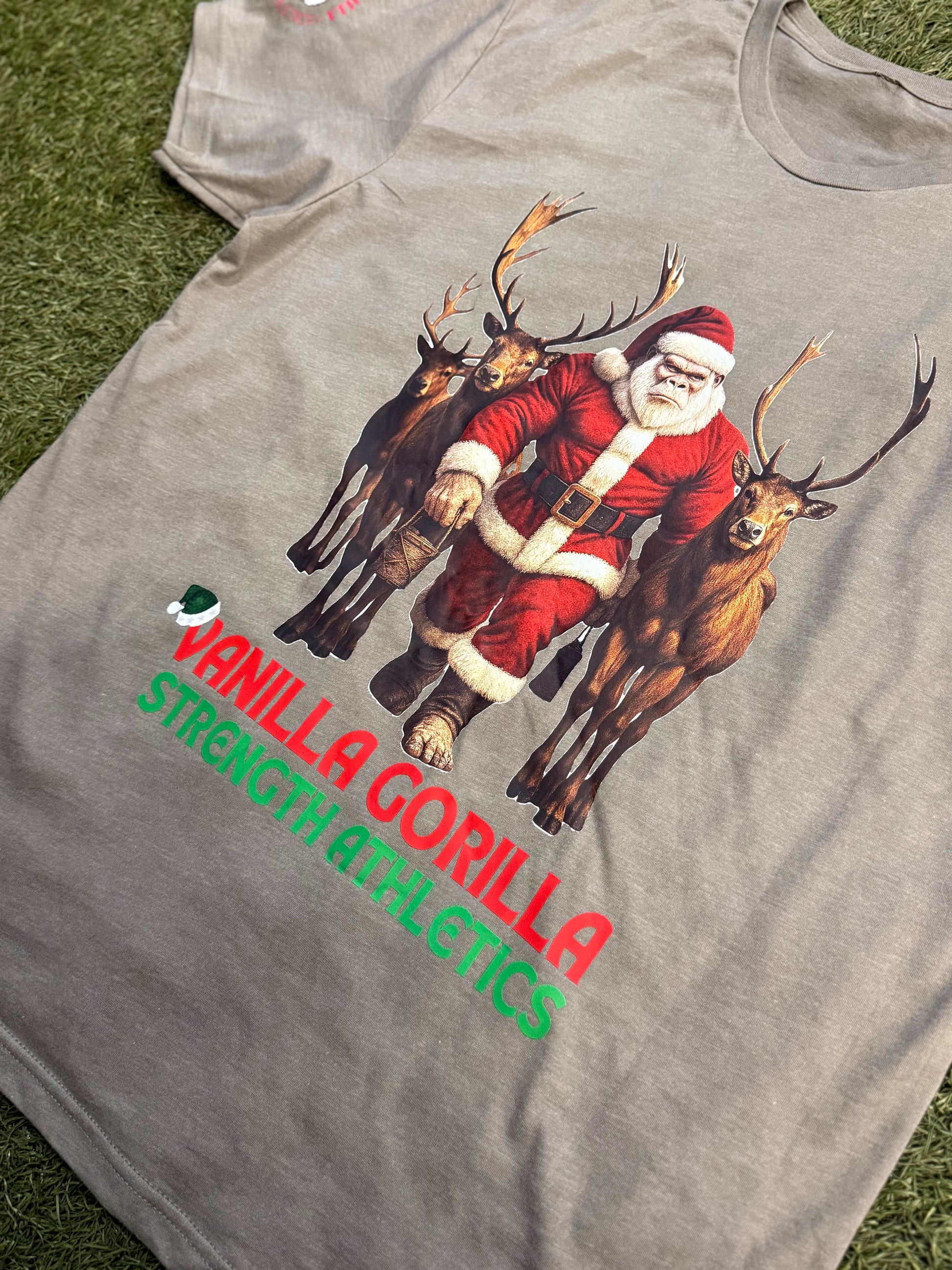 Comfortable, breathable, and soft T-shirt with the Christmas Ol Saint Gorilla design on the front.